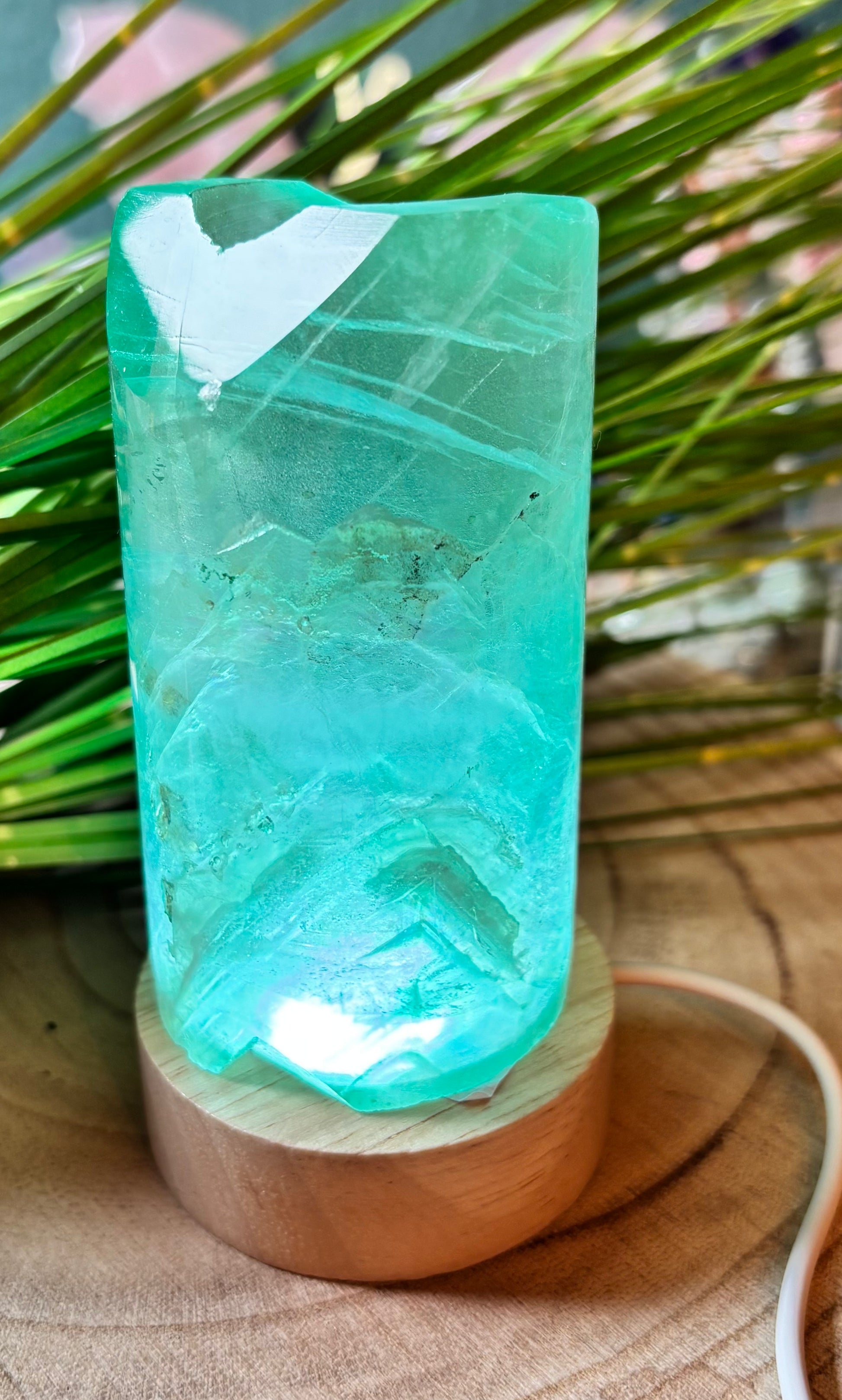 Der Fluorit besticht durch sein charakteristisches Farbspiel und seine natürliche Struktur. Poliert, um die einzigartige Maserung und Farbgebung des Minerals optimal zur Geltung zu bringen.