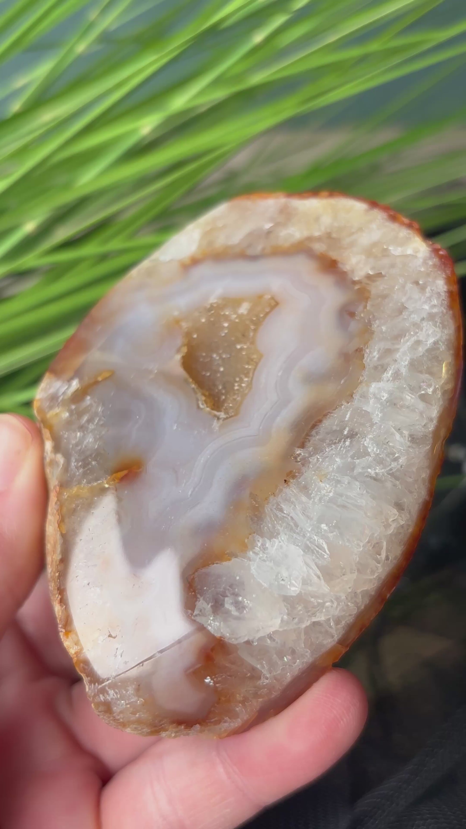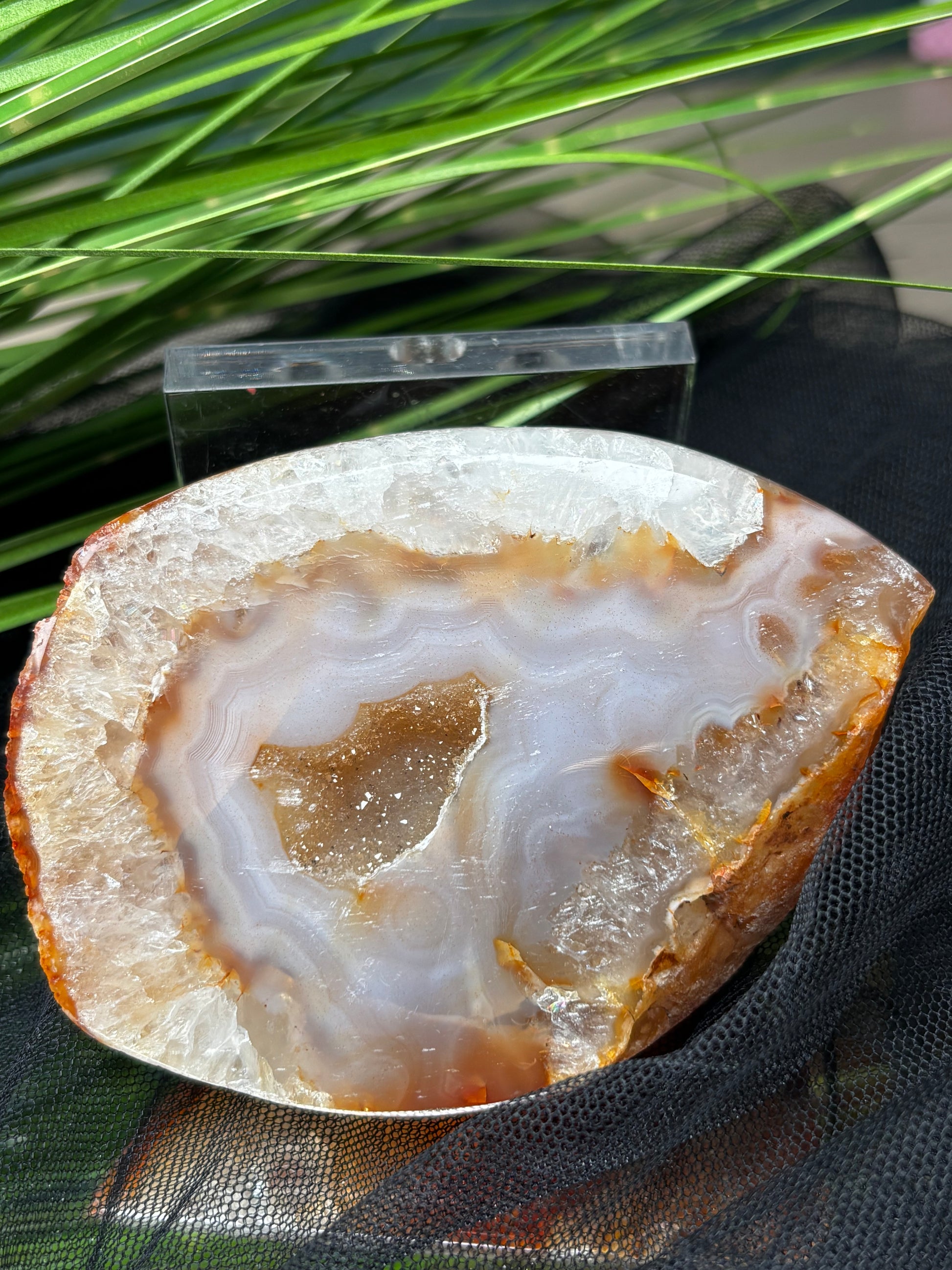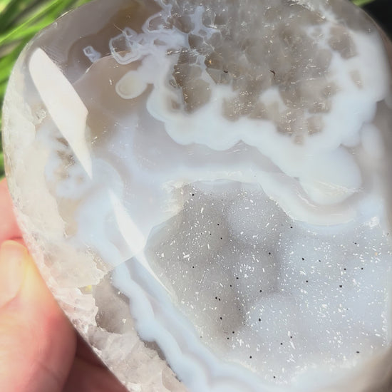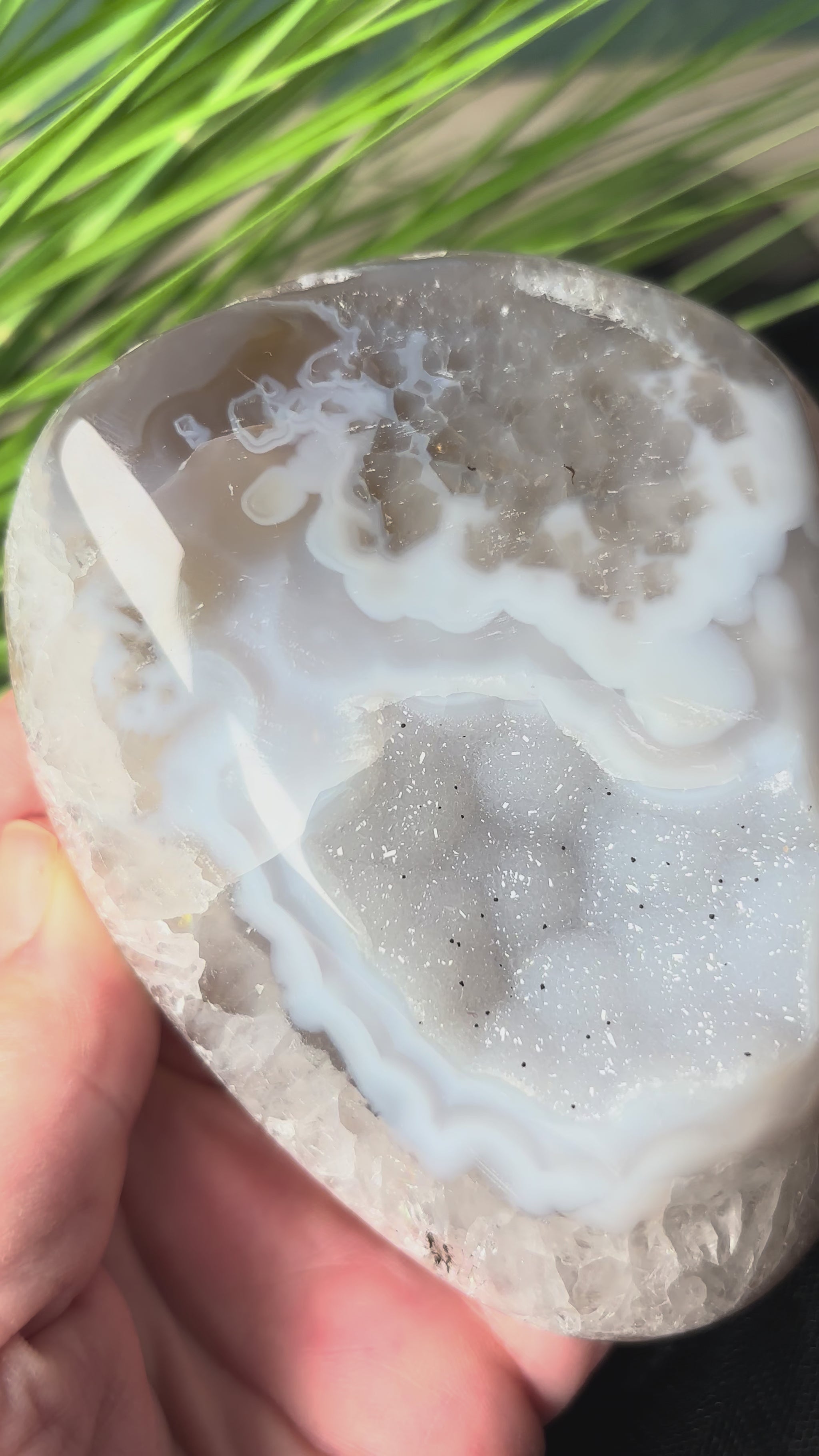 Der Achat gilt als Schutzstein, der innere Balance, Harmonie und Stabilität fördert. Die Drusen-Kristalle verstärken die energetische Wirkung und bringen zusätzliche Klarheit und Reinigung. Seine erdenden Eigenschaften helfen, im Hier und Jetzt zu bleiben.