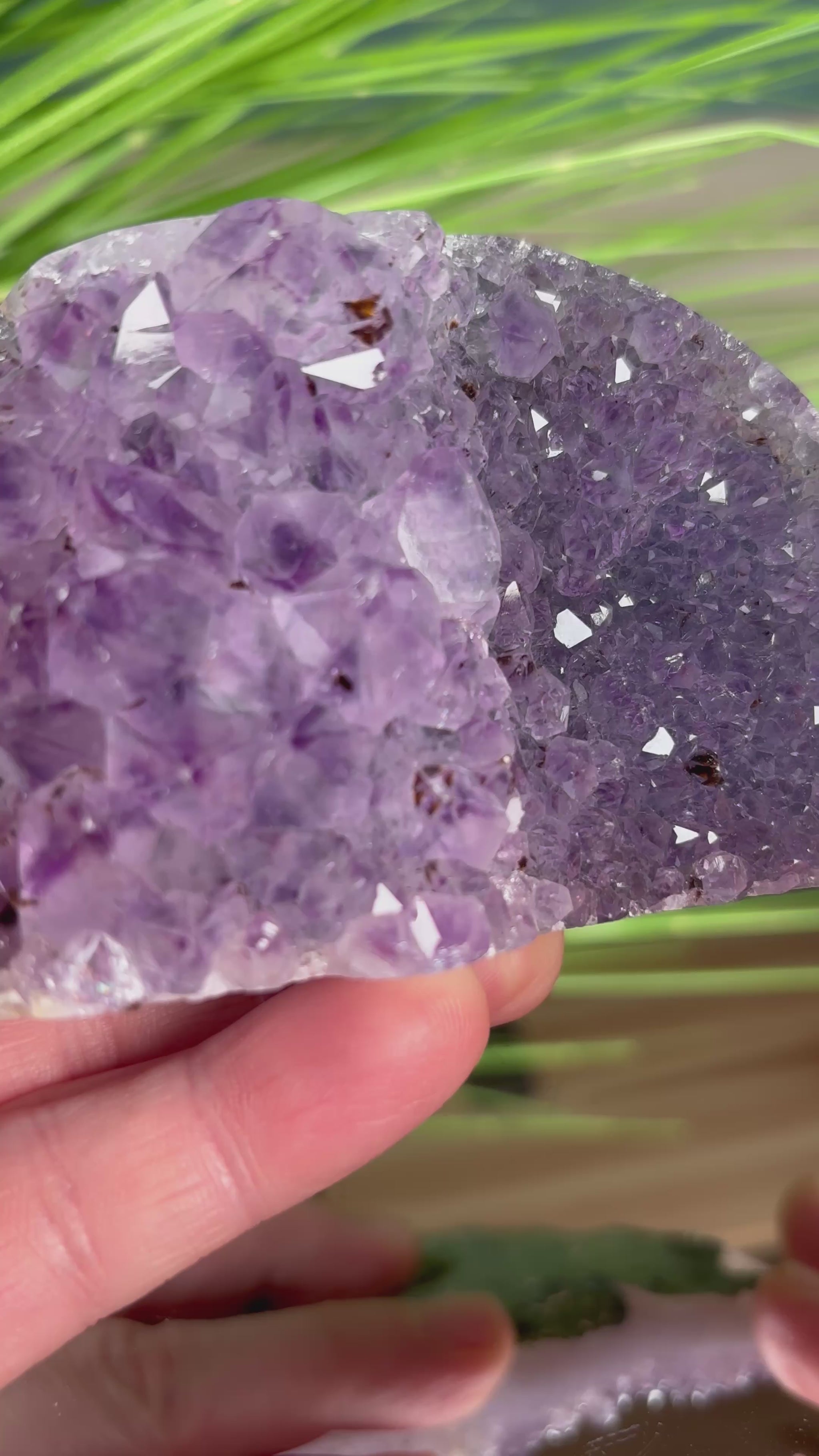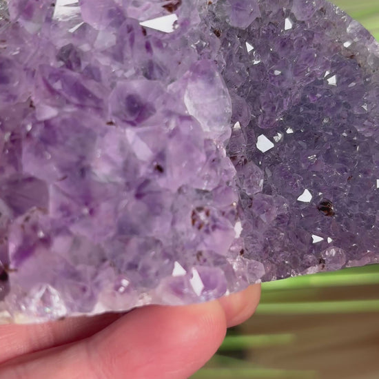 Außergewöhnliche Amethyst-Freiform mit beeindruckenden Kristallspitzen. Eine Hälfte zeigt große, markante Amethyst-Spitzen, während die andere Seite mit kleineren, funkelnden Kristallen besetzt ist – ein faszinierendes Zusammenspiel von Größe und Glanz.