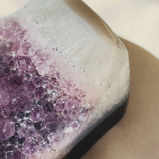 Achat Bänderung mit Amethyst Roh stück und vielen kleinen Regenbögen .