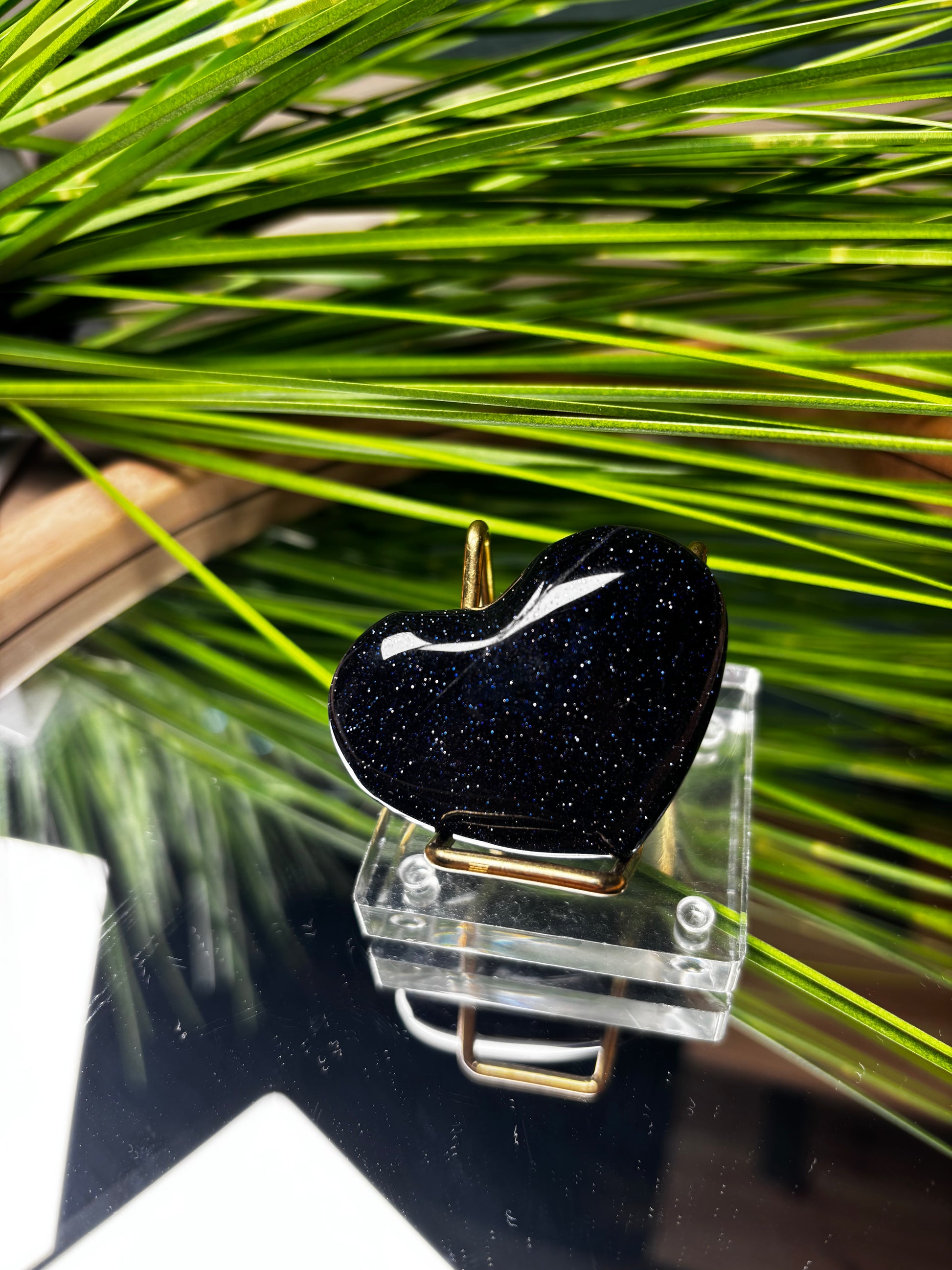 Dieses wunderschöne Blaufluss-Herz begeistert mit seinem tiefen, nachtblauen Glanz und den funkelnden goldenen Kupfereinschlüssen, die wie Sterne am Nachthimmel schimmern. Der Blaufluss, auch Goldfluss genannt, ist ein von Menschenhand geschaffenes Glas mit Kupferkristallen, das eine magische, beruhigende Ausstrahlung hat. Die liebevolle Herzform macht es zu einem perfekten Geschenk.