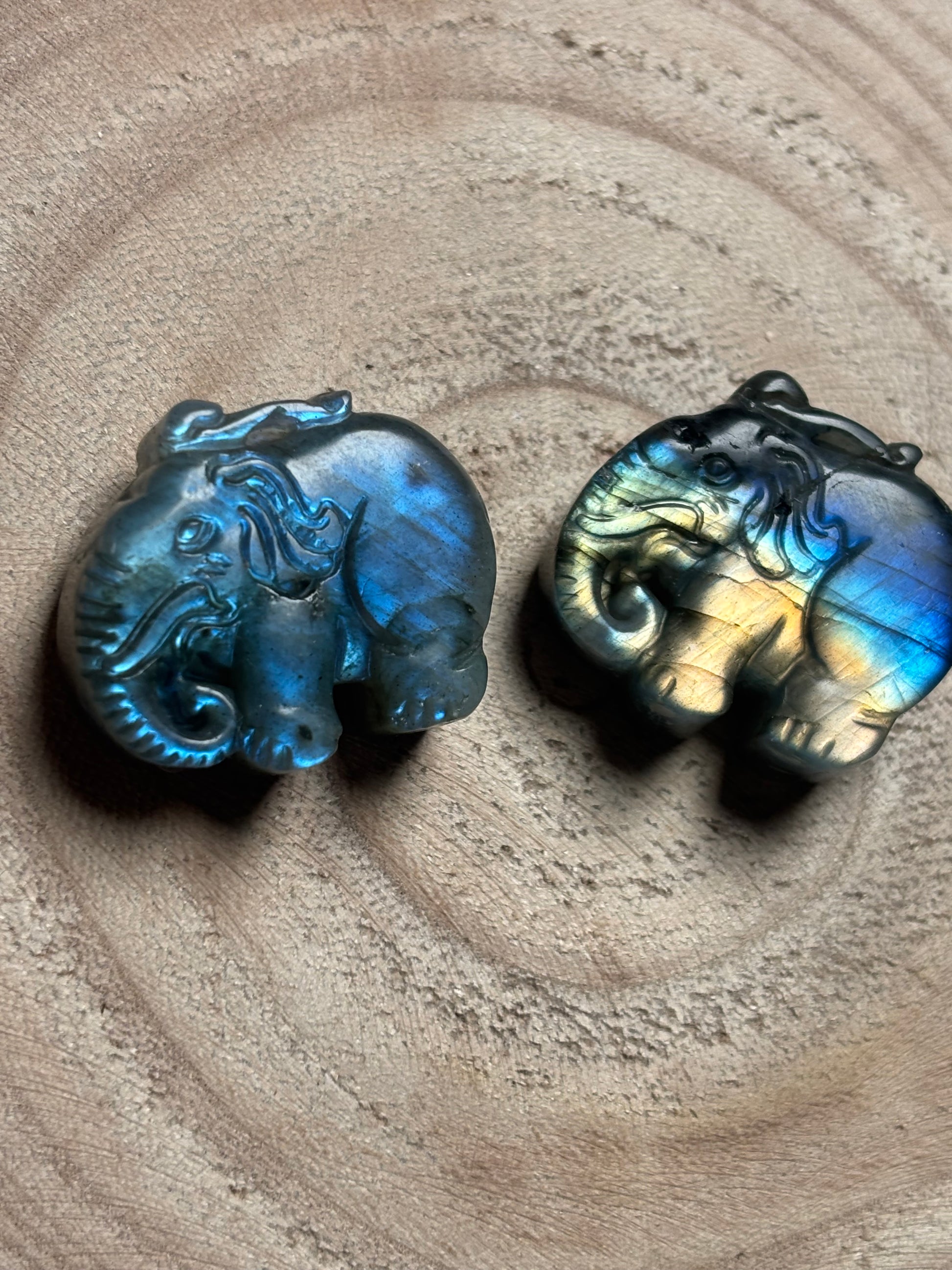 Handgeschnitzter kleiner Elefant aus schimmerndem Labradorit. Jedes Stück ist ein Unikat mit individueller Maserung und dem charakteristischen Farbspiel des Labradorits.