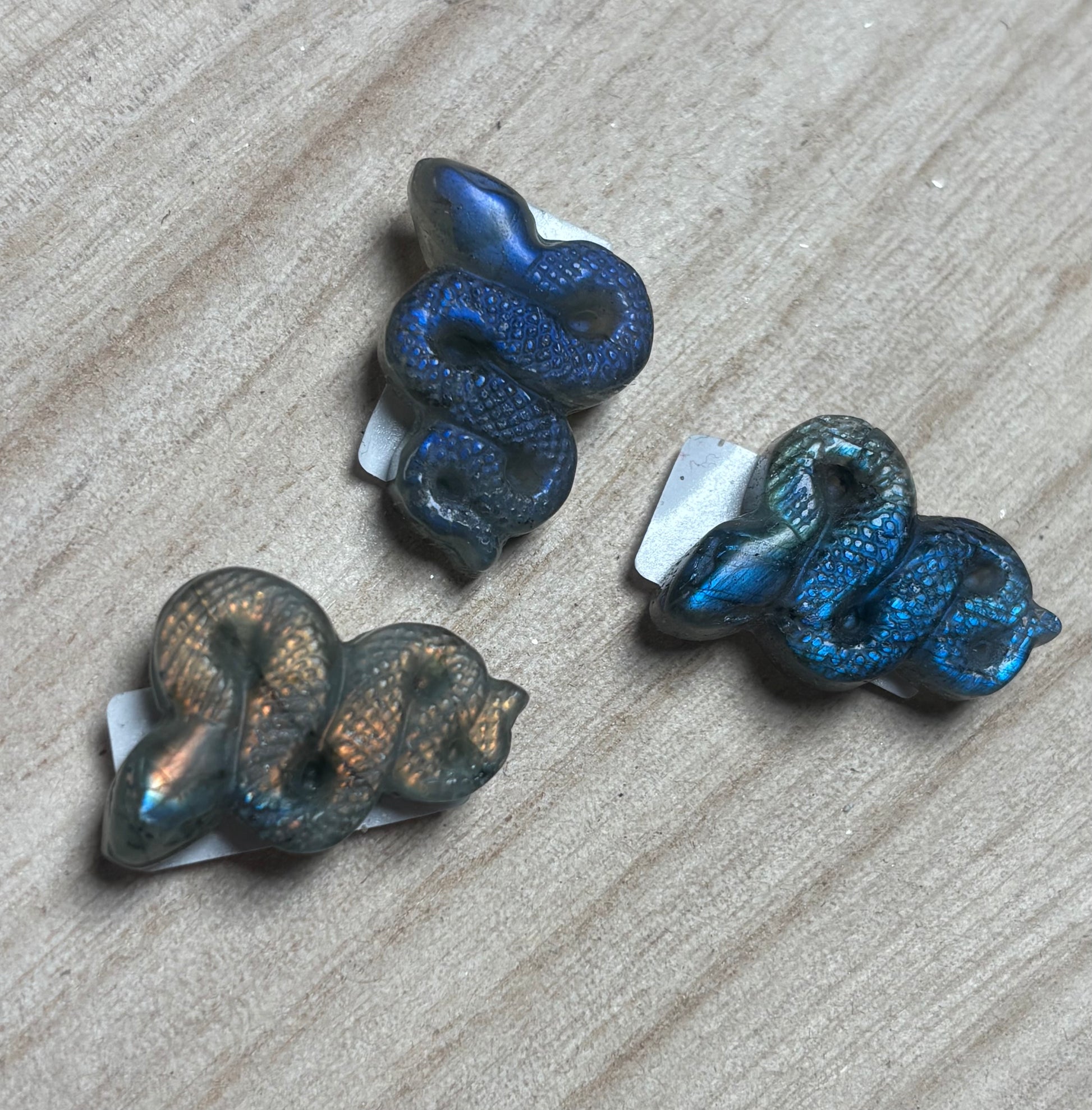 Handgeschnitzte kleine Schlange aus mystischem Labradorit. Jedes Stück ist ein Unikat mit dem charakteristischen schimmernden Farbspiel des Labradorits.