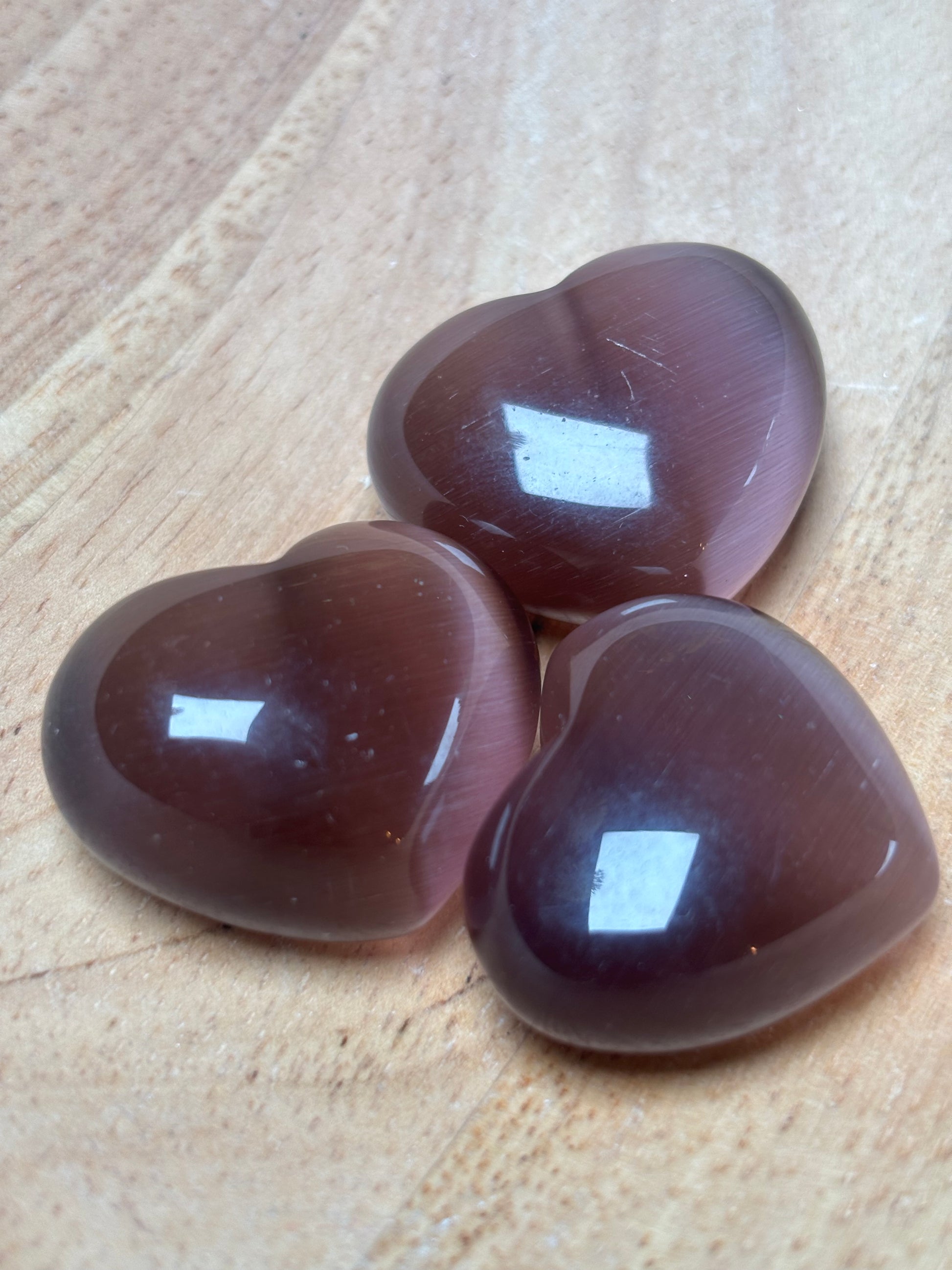 Kleine Herzen aus Cat Eye Stein mit faszinierendem Lichteffekt. Der charakteristische Lichtstreifen wandert über die Oberfläche und sorgt für einen einzigartigen Schimmer.