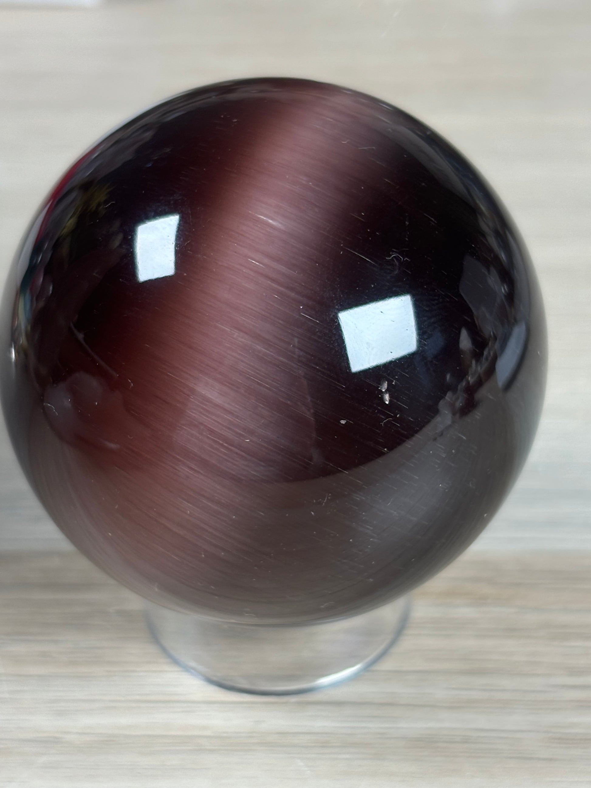 Gefärbte Selenite Kugel mit faszinierendem Cat Eye Effekt. Der schimmernde Lichtstreifen gleitet über die polierte Oberfläche und erzeugt einen hypnotisierenden optischen Effekt.