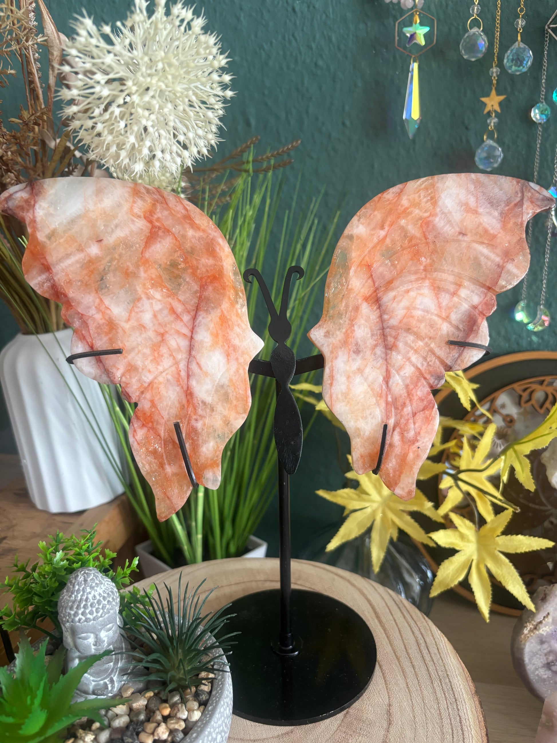Dieser wunderschöne Schmetterling aus leuchtendem Feuerquarz fängt das Licht ein und verzaubert jeden Raum mit seinem warmen, feurigen Glanz. Die intensiv roten bis orangefarbenen Nuancen des Feuerquarzes symbolisieren Lebensfreude, Transformation und positive Energie.