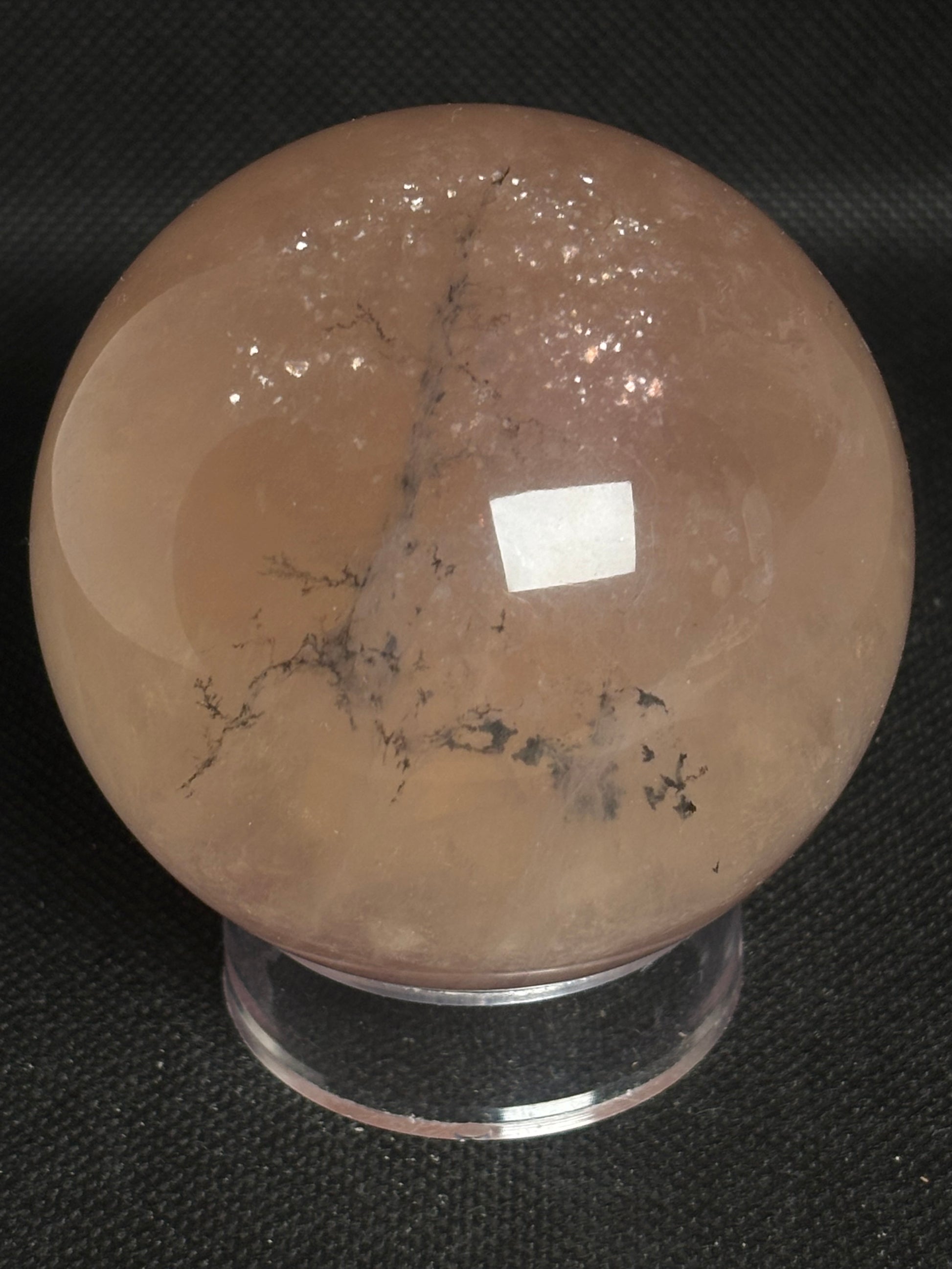 Außergewöhnliche Fluorit Kugel mit natürlichen Dendriten-Einschlüssen und glitzerndem Mica. Diese seltene Kombination vereint die klärenden Eigenschaften des Fluorits mit faszinierenden baumartigen Mustern und funkelnden Akzenten. Perfekt für Meditation, Konzentration oder als einzigartiges Sammlerstück.