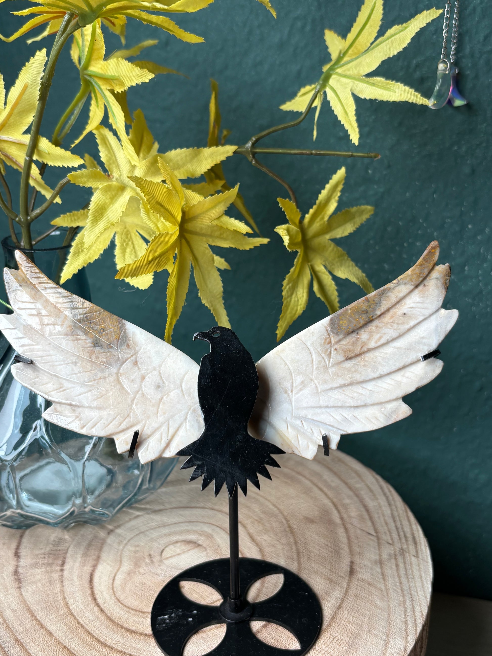 Erleben Sie die faszinierende Verbindung von meisterhafter Handwerkskunst und natürlicher Kristallschönheit. Diese kunstvoll geschnitzte Krähe aus edlem Jaspis auf elegantem Ständer ist ein außergewöhnliches Kunstwerk, das Mystik und Eleganz vereint.