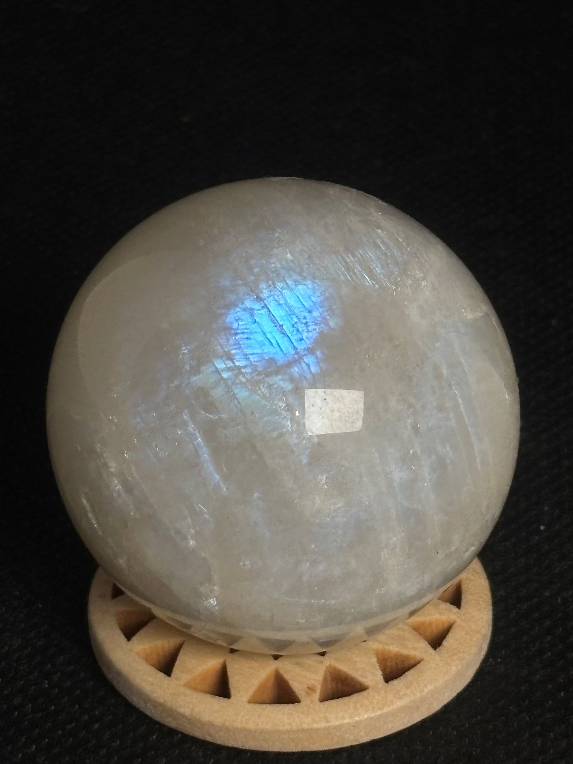 Mystische Mondstein Kugel mit bezauberndem blauen Flash-Effekt. Dieser magische Edelstein zeigt faszinierende Lichtreflexe, die an Mondschein erinnern. Perfekt für Meditation, Intuition und emotionale Balance oder als geheimnisvolles Dekorationsstück mit natürlichem Schimmer.
