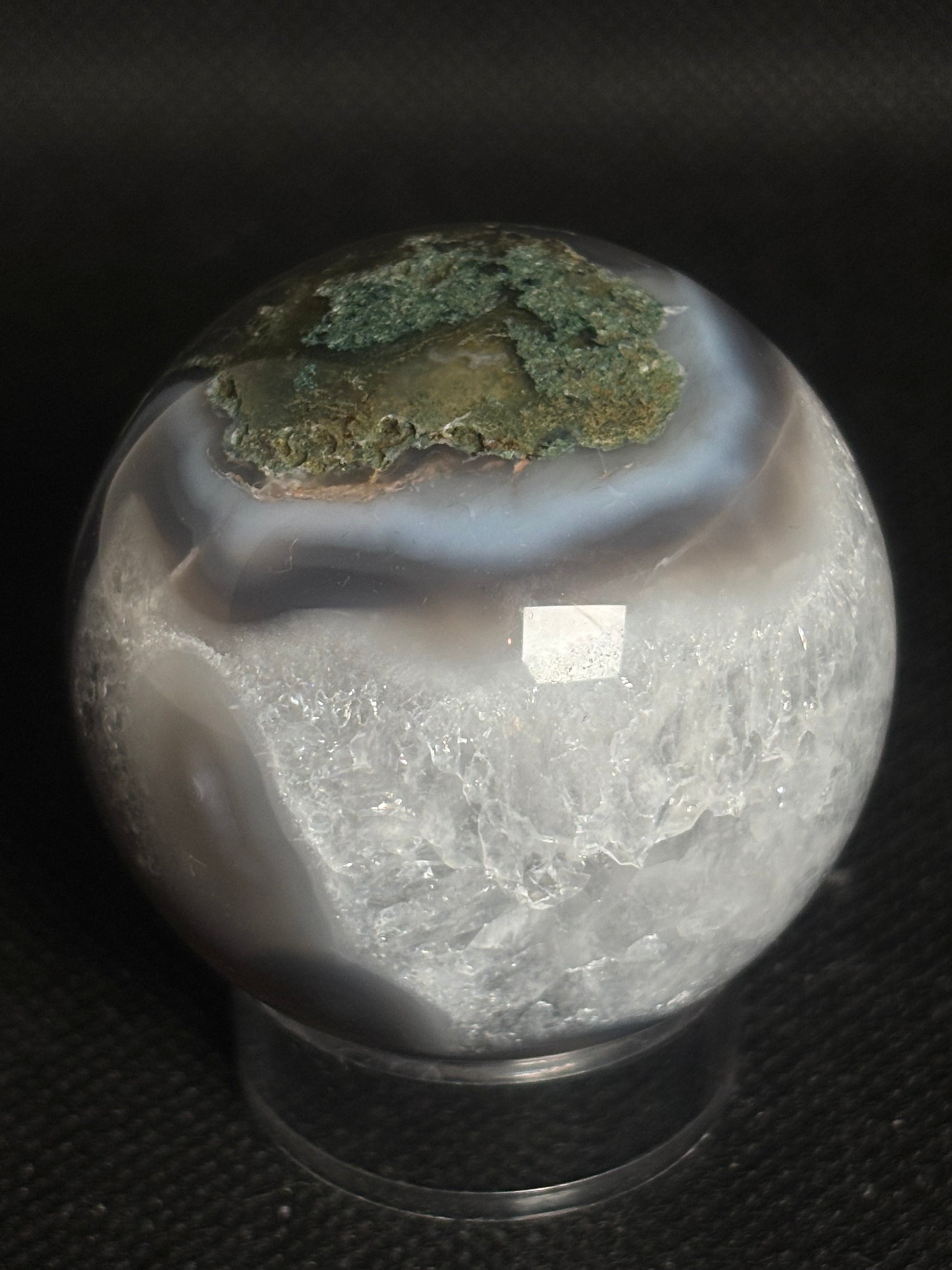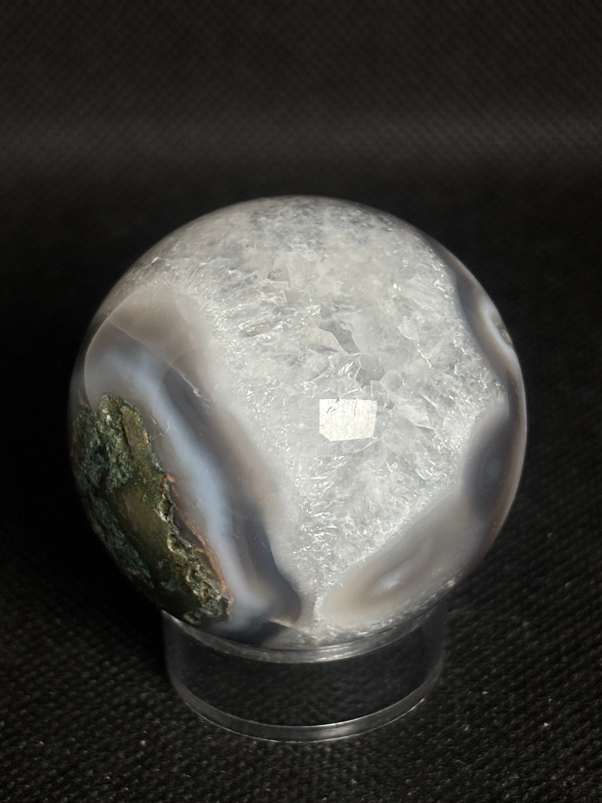 Bezaubernde Moosachat Kugel mit natürlichen grünen Einschlüssen, die an moosbedeckte Landschaften erinnern. Dieser erdende Edelstein fördert innere Ruhe, Wachstum und Verbundenheit zur Natur. Perfekt für Meditation, Energiearbeit oder als naturnahes Dekorationsstück.