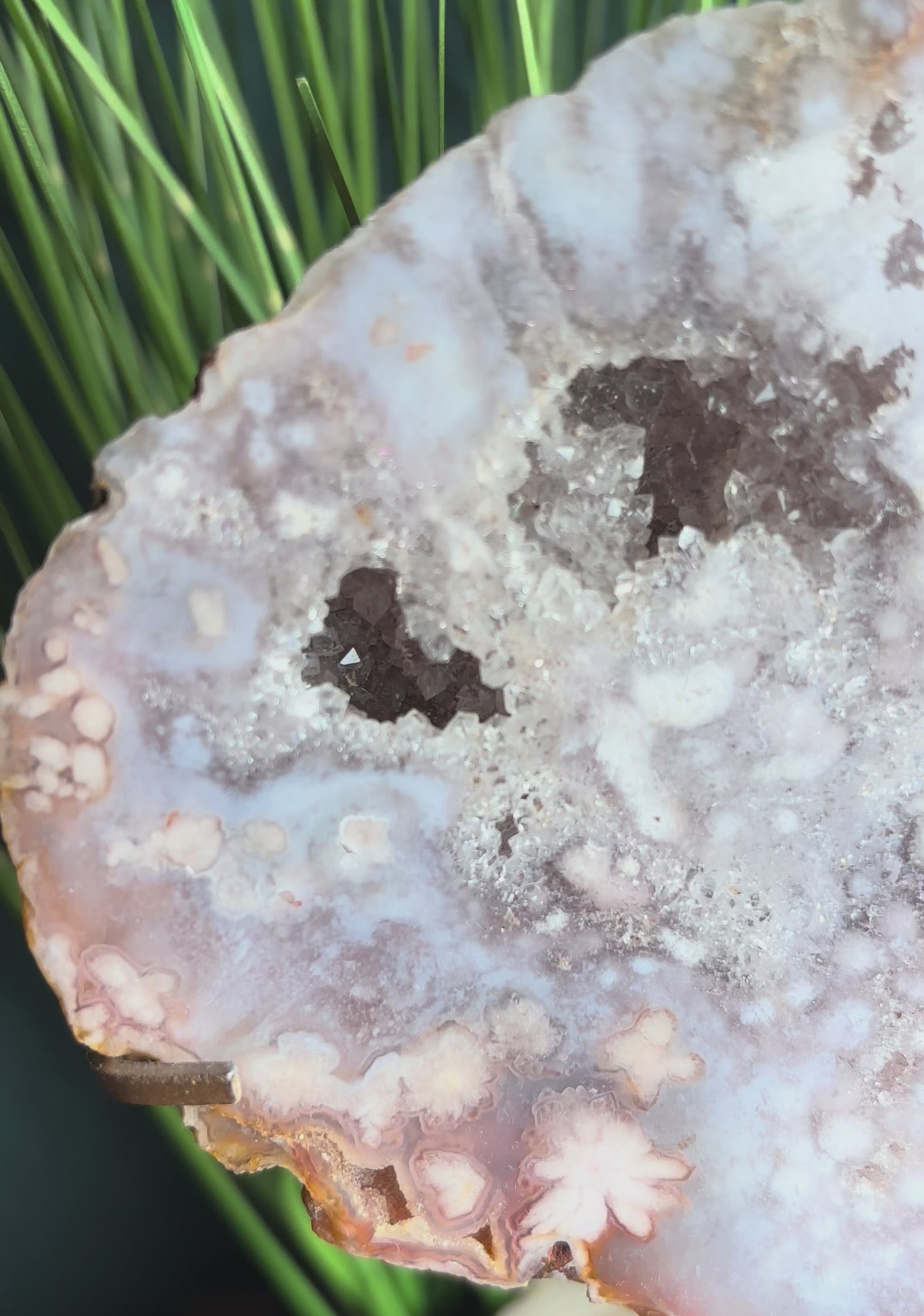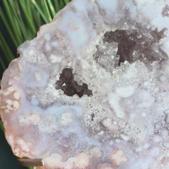 Pink Amethyst mit Blumenachat Scheiben auf Gold Stand