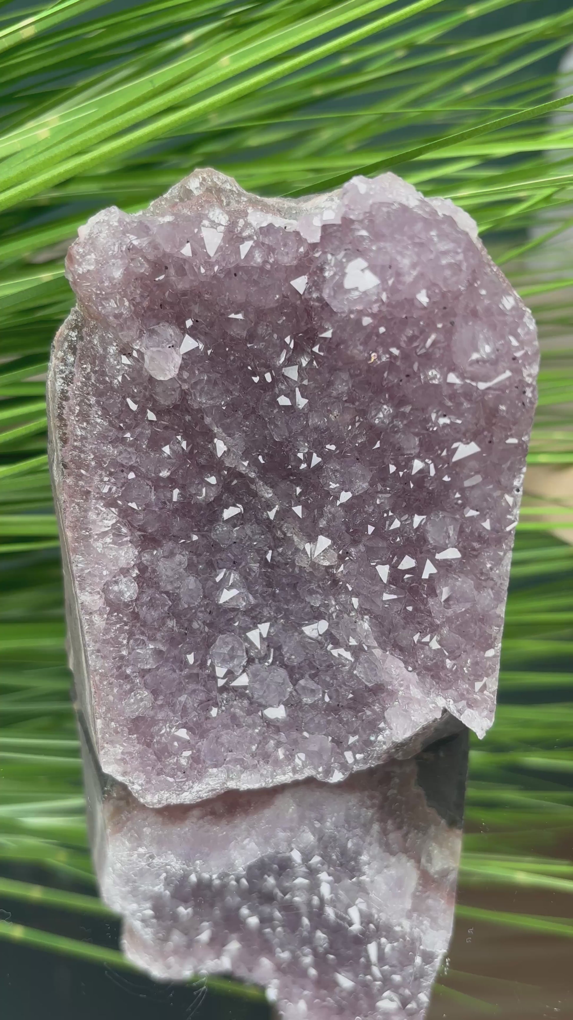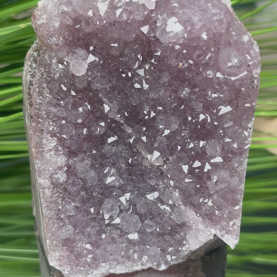 Dieser wunderschöne Regenbogen-Amethyst-Cluster in natürlicher Freiform begeistert mit seinen zarten Pastell-Lilatönen und funkelnden Kristallspitzen. Die natürliche Amethyst-Druse zeigt sanfte, helle Violetttöne statt dunklem Purpur, kombiniert mit Regenbogen-Effekten und glitzernden Kristallformationen. Mit 9,9 cm Höhe und 8,3 cm Breite ist er ein bezauberndes Naturwunder in seiner ursprünglichen, organischen Form.